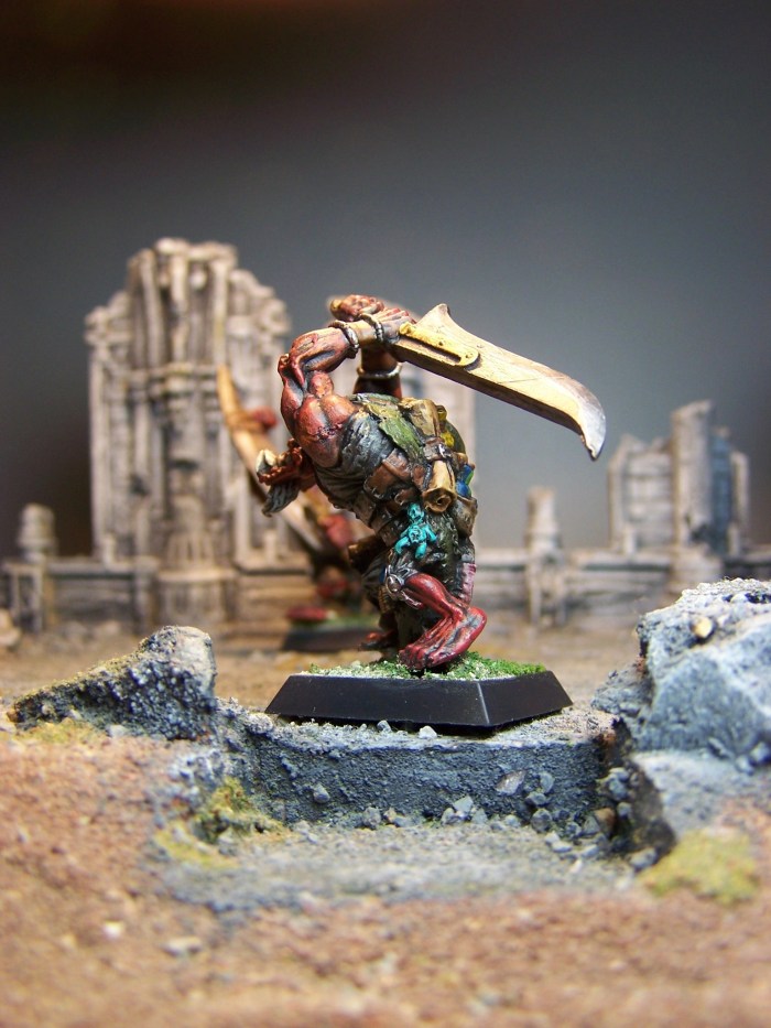 I got these two Orc Tracker Confrontation models from a buddy of my that was putting a Orc army together, but after a few years he gave up on them. He had started to paint them with out primer. So when got them I had to decide if I would strip them or paint over the what was started. I decide to work over the existing paint. He had some good base coats down and I liked where it was going. I normally would not paint on bare metal. So when they were done I sealed them with Model Master flat Clear Acryl/4636. The only thing I do not like so much is the sheen the sealer give the model. In the end the paint job is protected, and I can live with the finish.