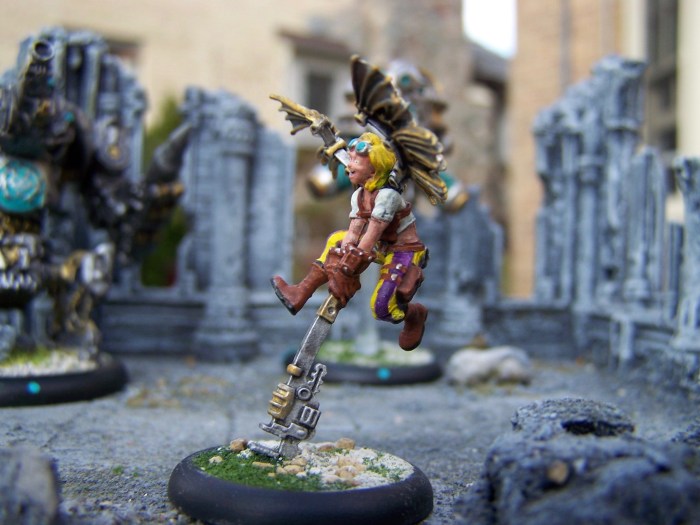 This wiz with a wrench has a place on your bench! As good at fixing things as she is at breaking them—you can see the advantage to that—Widget will leave your opponent asking where this angel got her wings. (Answer: She crafted them out of the sorry scraps of the last scavenger to get in her way.)